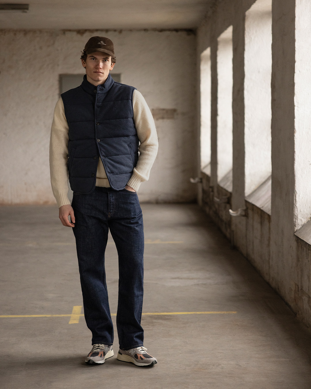 In this example, we start from the same base. Dark jeans, a light knitted sweater, and a navy quilted vest. The silhouette is relaxed yet considered. The color palette is safe: blue, denim, and warm off-white.