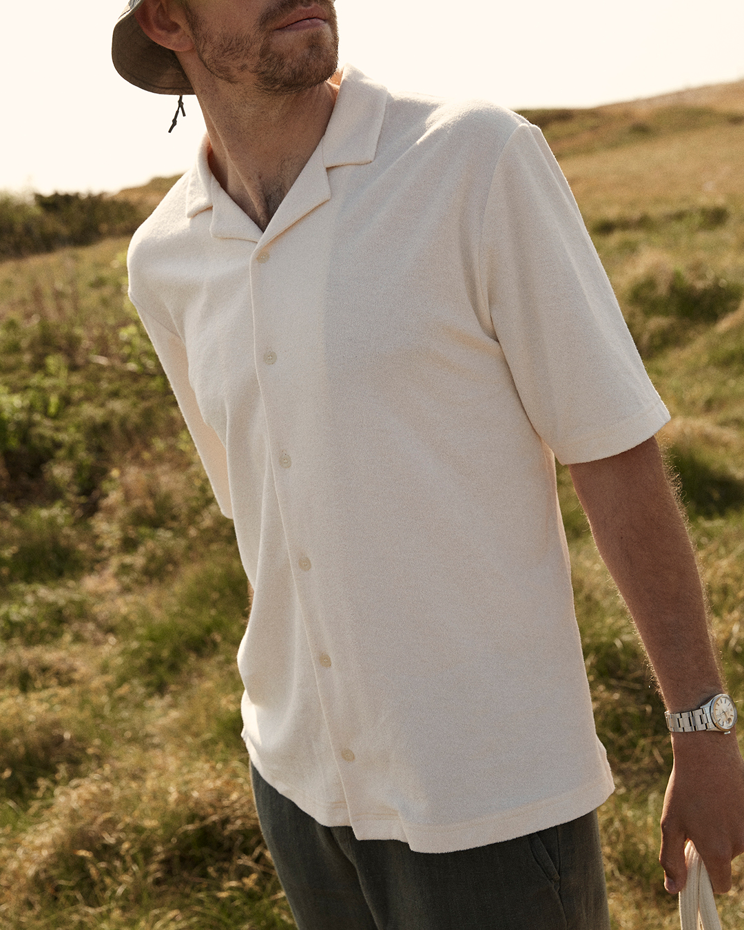 The white resort shirt from our collaboration with Britain’s Sunspel comes in a finer terry and is reminiscent of "French Terry", which is often found on the inside of sweatshirts and hoodies. This resort shirt can be worn either on its own or with a tank top or t-shirt underneath. Wear it with a pair of drawstring linen trousers, Birkenstocks and a bucket hat from Japan’s BEAMS for an understated and casual summer style.