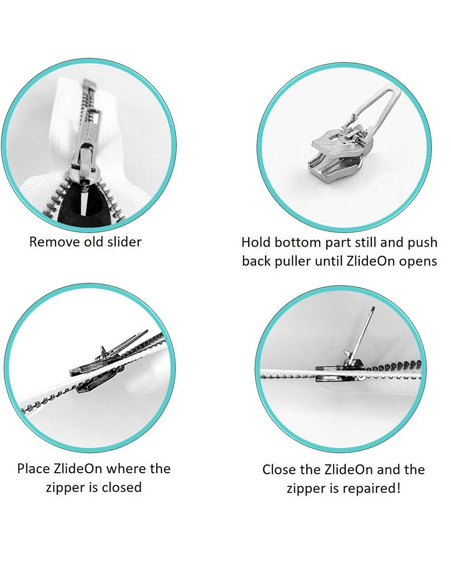 Cómo cambiar el deslizadorRetira el deslizador roto con unos alicates, abre el deslizador de ZlideOn y fíjalo a la cremallera cerrándolo. El deslizador se puede colocar al principio de la cremallera o donde la cremallera aún esté junta.Número de artículo del producto25003410